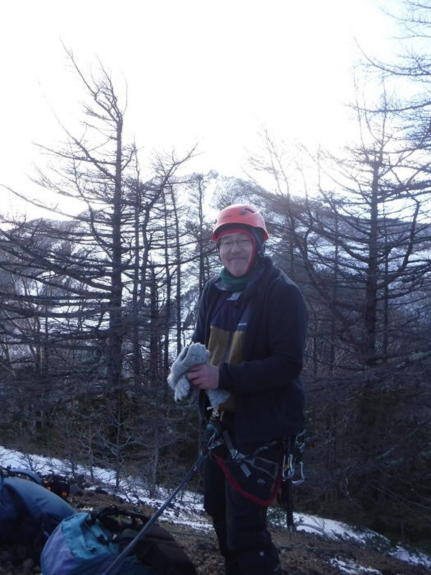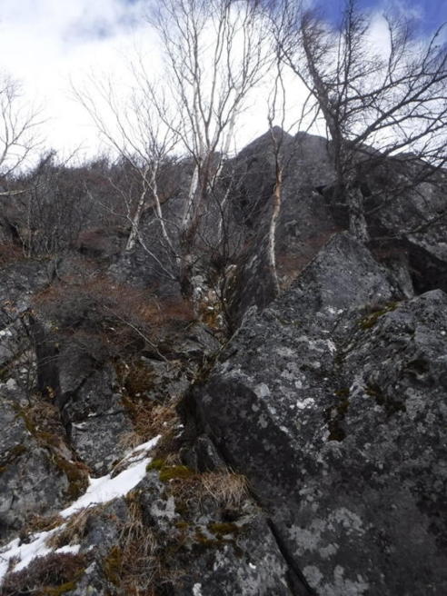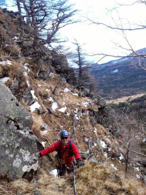 ![]() 少し迷ったが、無事に南壁に到着、さて何処を登ろうか?左カンテルートを登ろうと取り付きを探すも判然としない、此処だろうと思って登り始めたのが左カンテ変則ルーートでした。 まだシーズン初めということもあり雪が少ないのは良いのだが、木が茂っていて登りずらかった。 |