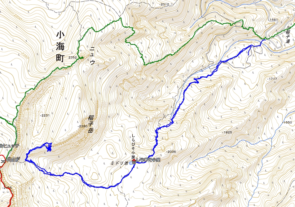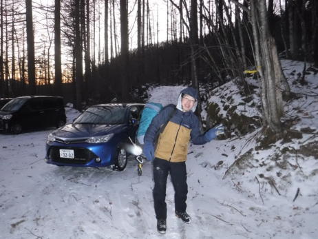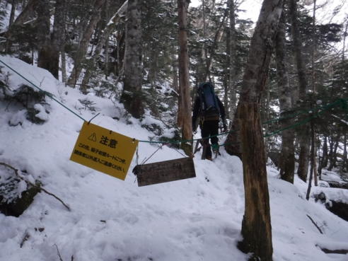 今回は、八ヶ岳の稲子岳南壁冬期登攀と言うことで、みどり池駐車場に車を停め、出発! メンバーは大師匠のDさんとオイラ勝蔵、思っていたよりもアプローチが長い(汗) しらびそ小屋を過ぎて中山峠手前の標識から入っていく。 |