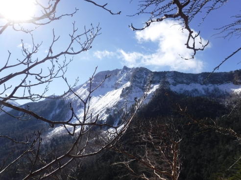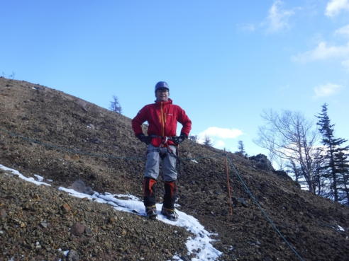 1P、2PはDさんリード。 天狗岳が綺麗に見える、2Pを登って行くとDさんが何やらショッパイ顔している、どうしたの?と聞くと疲れたから3P目は勝蔵が行けとのこと。 3Pは勝蔵リード 4PはDさんがリードしトップアウト。 当初の予定の左カンテルートの隣のルートにはなってしまったが、まぁ稲子岳南壁冬期登攀は成功と言うことで(笑) 下山ルートは踏み跡を拾って行けば迷うことはありませんでした。 日帰りで行けるルートではあるが、岩場までのアプローチが少し長めなので疲れたよ。 |